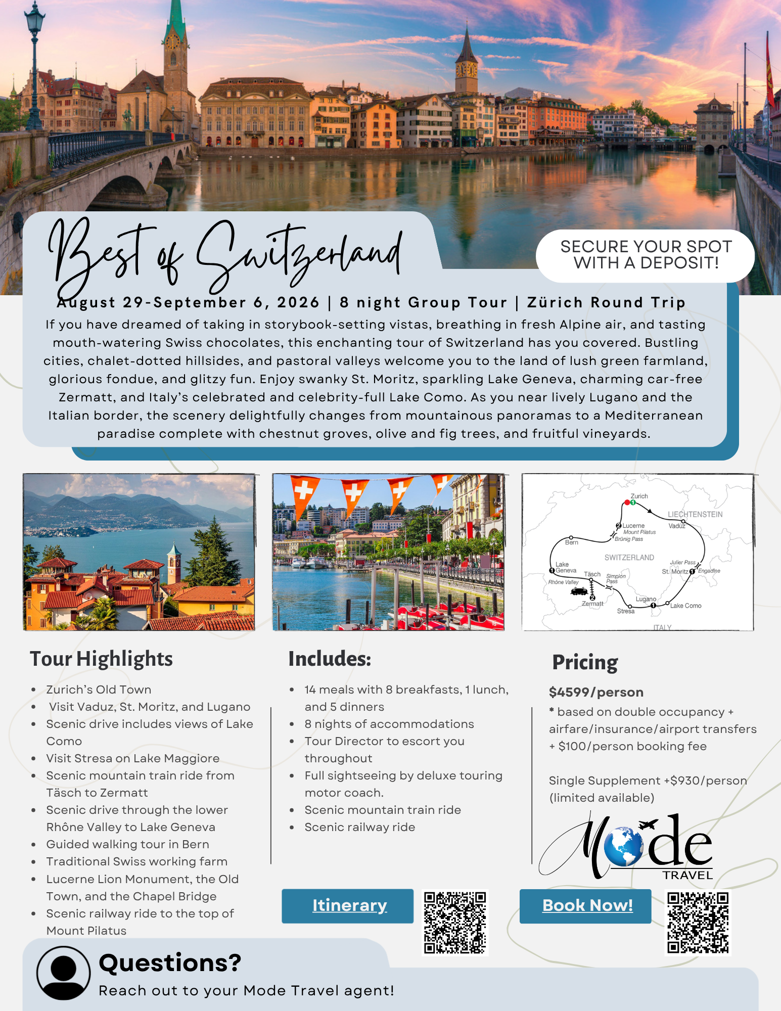 If you have dreamed of taking in storybook-setting vistas, breathing in fresh Alpine air, and tasting mouth-watering Swiss chocolates, this enchanting tour of Switzerland has you covered from A to Zurich. Bustling cities, chalet-dotted hillsides, and pastoral valleys welcome you to the land of lush green farmland, glorious fondue, and glitzy fun. Join the capricious and carefree in the posh playgrounds of swanky St. Moritz, sparkling Lake Geneva, charming car-free Zermatt, and Italy’s celebrated and celebrity-full Lake Como. As you near lively Lugano and the Italian border, the scenery delightfully changes from mountainous panoramas to a Mediterranean paradise complete with chestnut groves, olive and fig trees, and fruitful vineyards. Dinner at a shady and cool grotto and lunch on a traditional Swiss farm provide local, delectable dining experiences like no other.